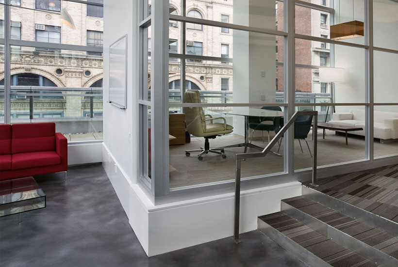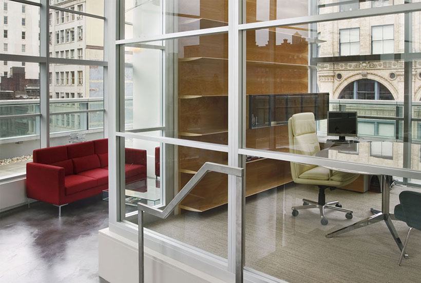 會議室里的人字形地毯條紋地毯在交易大廳是傳統(tǒng)的男裝衣料的當(dāng)代借鑒。有木鑲板在辦公室,但在歐洲輕型核桃,用干凈的細(xì)節(jié)。